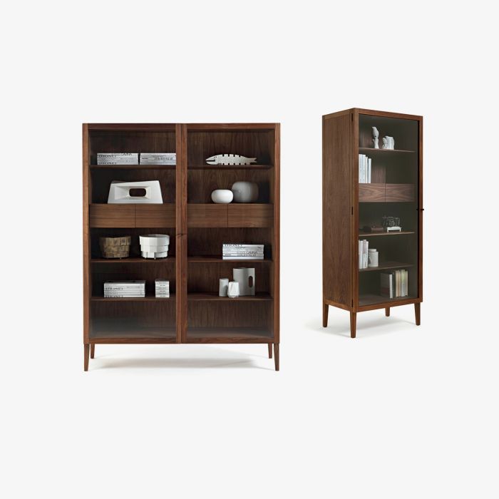 Das, was die gesamte Serie LIGHT von Matteo Thun gemein hat, sind die optisch reduzierten Wandstärken der Einlegeböden und Strukturen, ohne auf die Solidität eines Massivholzproduktes zu verzichten. Die Flügeltür besteht aus transparentem Glas und wird von einem feinen Massivholzrahmen umschlossen. Der Innenraum wurde für eine bestmögliche Nutzung des Platzes mit zwei kleinen Schubladen und drei Einlege-böden aus Holz versehen.