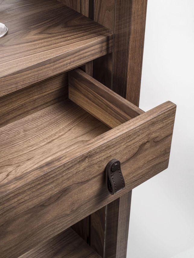 Medames et Messieurs, voilà Reflex, die moderne Vitrine der Marke Riva 1920 Reflex verfügt über eine umlaufende Holzstruktur, zwei transparente Glasfronttüren mit Ledergriffen, eine transparente Glasrückseite und, um die Innenausstattung zu vervollständigen, eine LED-Beleuchtung auf beiden Seiten. Das Design ist traditionell schlicht und immer aktuell, so wie es raffinierte Eleganz erfordert, die Verarbeitung ist ein wahrer Genuss, die Einrichtung ist das gewisse Extra, das dem Prestige Einzigartigkeit und Vornehmheit verleiht. Reflex, die Vitrine.