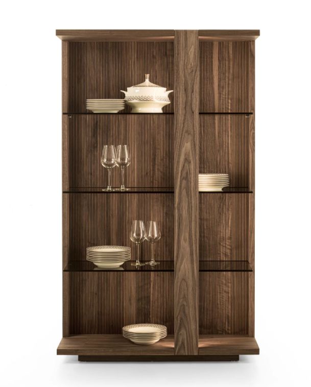 Hier sehen wir Revo Open, die offene Anrichte, ein weiteres wunderschönes Stück aus der Revo-Möbelgruppe, das vom Riva 1920-Team angeboten wird. Die Struktur aus massivem Holz ist in der Höhe, in der Einheitsgröße, mit den Glasböden und der Schönheit, die man bewundern kann, zu sehen. Die beiden vorgeschlagenen Versionen unterscheiden sich in der Position der Dekoration: Der Fresart-Verarbeitungseffekt wird entweder auf der Außenseite der drei vertikalen Elemente der Struktur oder auf der inneren Rückenlehne derselben platziert, beide Lösungen sind absolut entzückend. Revo Open, das Einrichtungs- und Dekorationsmöbel für Räume, in denen man sich rundum wohlfühlen kann. Das Sideboard, Exzellenz Made in Italy, Revo Offen für alle und für immer.