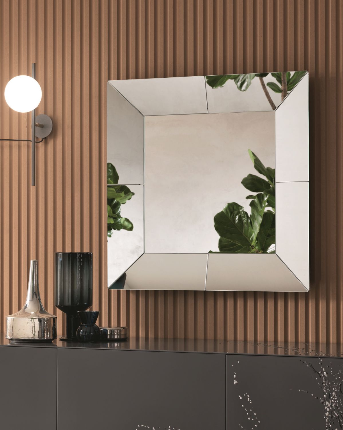 Cube lädt das Auge dazu ein, die Reflexionen aus verschiedenen Blickwinkeln zu erkunden, und der geneigte Rahmen verleiht dem Design eine dynamische Wirkung. Dieser Wandspiegel fügt sich harmonisch in unterschiedlichste Einrichtungsstile ein, von minimalistischen Räumen bis hin zu urbanen, markanten Umgebungen. Als funktionales Spiegelobjekt und dekoratives Designstück bereichert Cube jedes Zuhause oder hochwertige Objektflächen mit Eleganz und Licht.