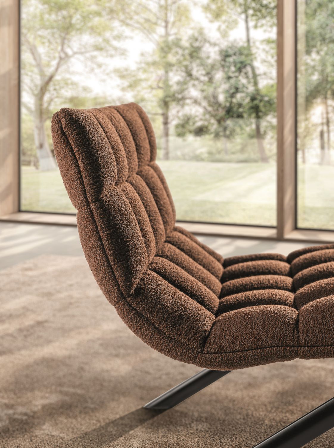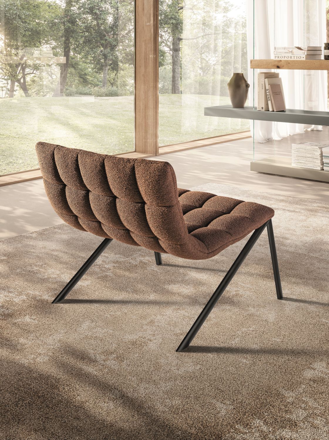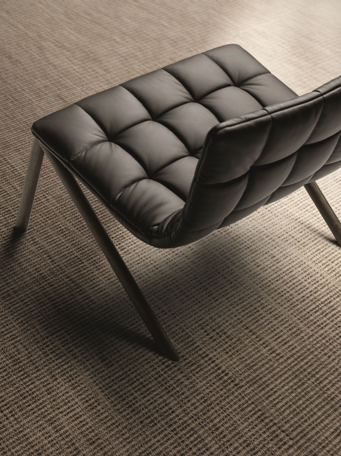 The Mezz’aria armchair stands out for its quilted upholstery that embraces the seat and backrest, offering a welcoming and comfortable seating experience. The distinctive angled legs and absence of back supports give it a dynamic silhouette that makes it ideal for contemporary living rooms and sophisticated lounge areas.