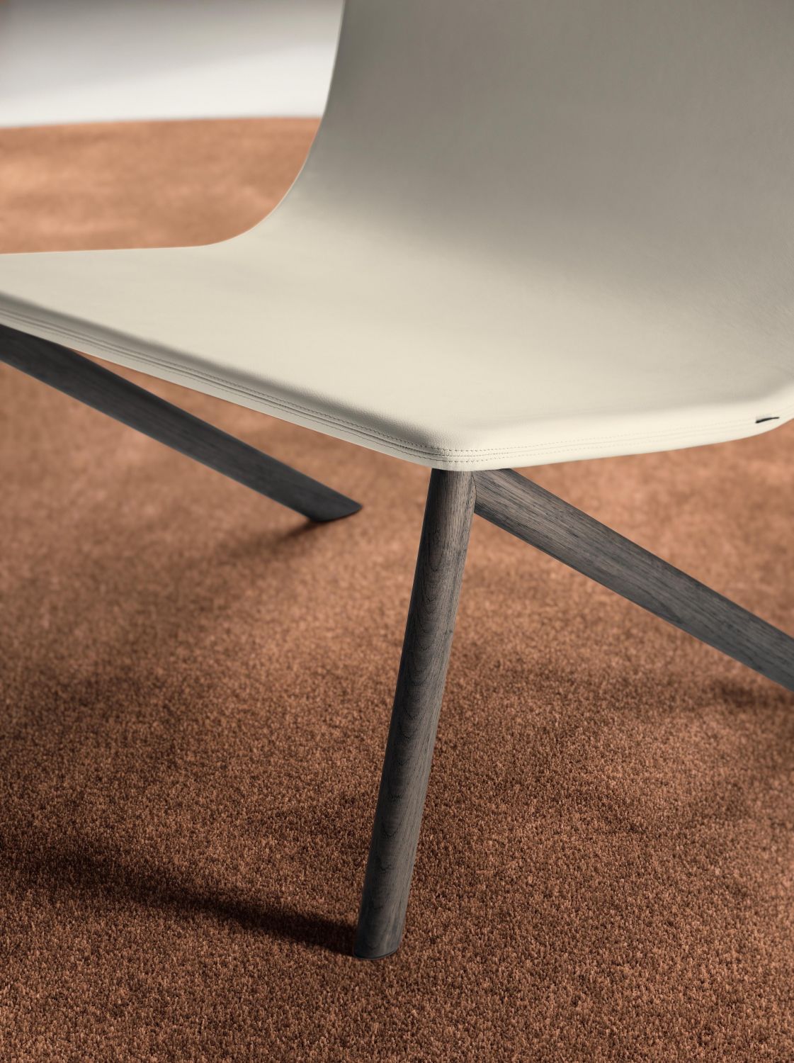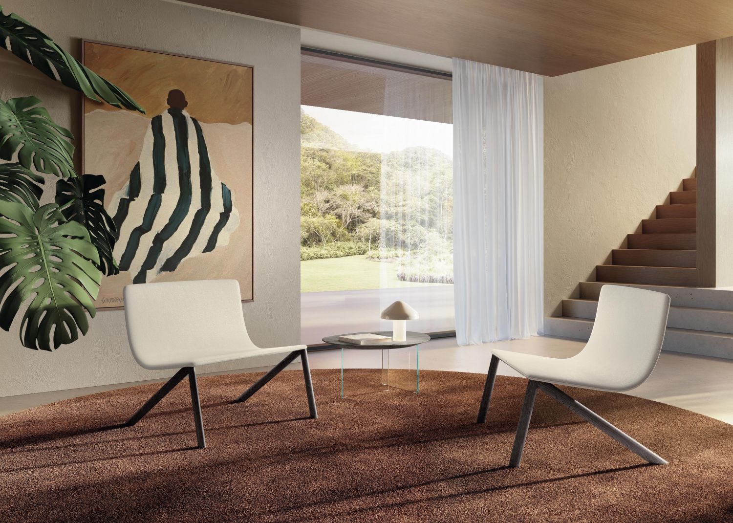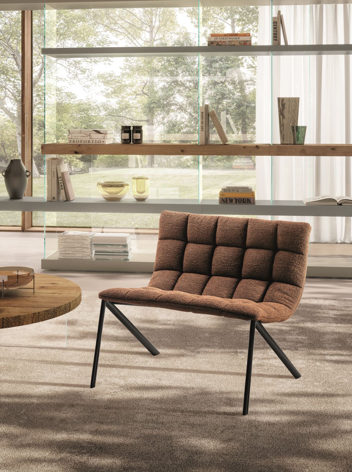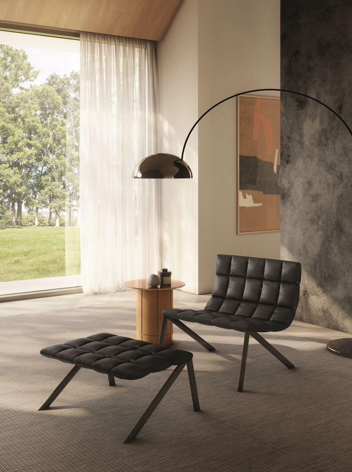 The Mezz’aria armchair stands out for its quilted upholstery that embraces the seat and backrest, offering a welcoming and comfortable seating experience. The distinctive angled legs and absence of back supports give it a dynamic silhouette that makes it ideal for contemporary living rooms and sophisticated lounge areas.