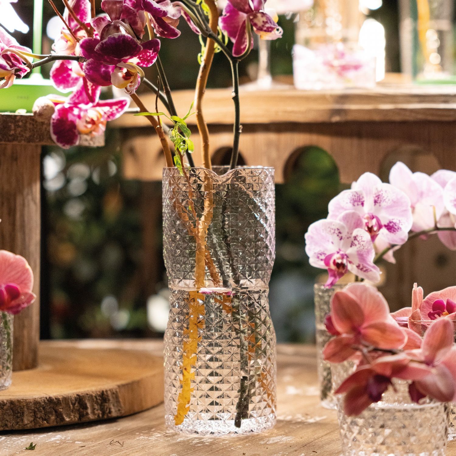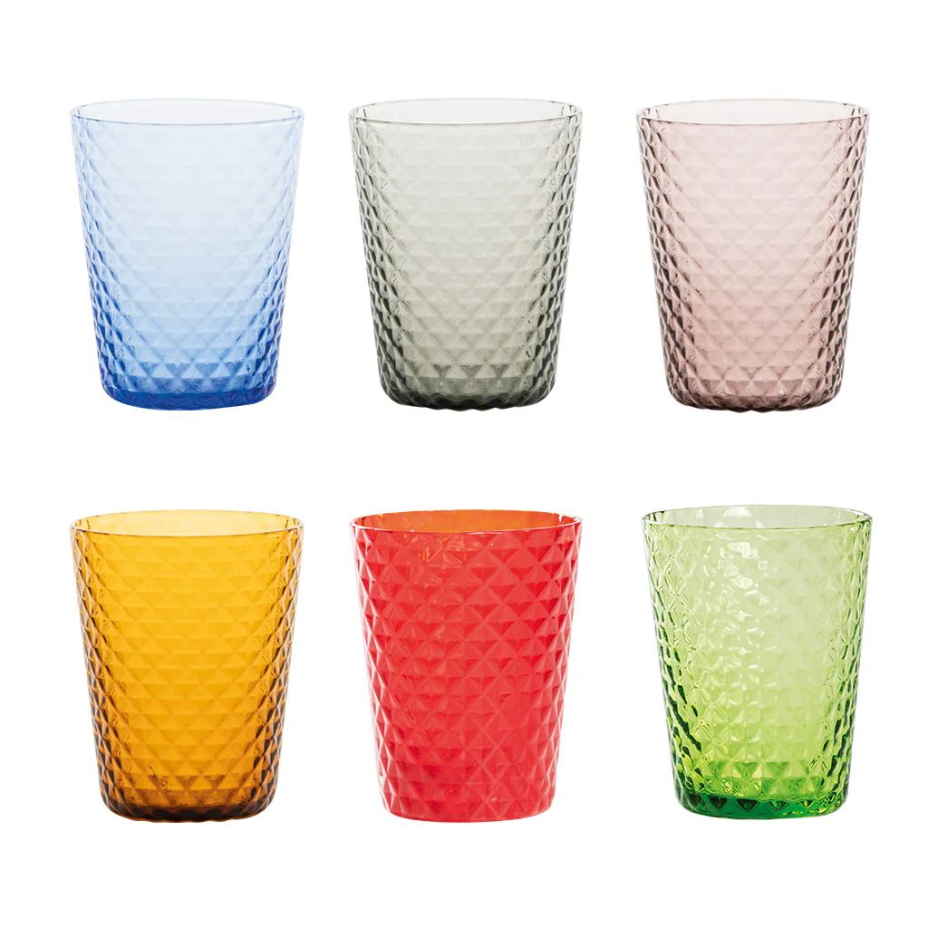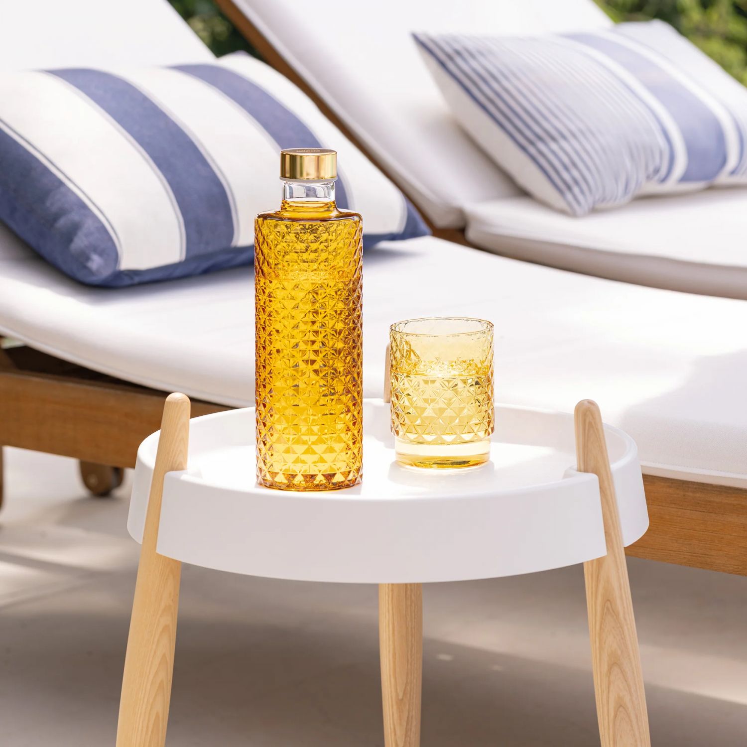The Isolano set includes glasses, wine glasses, carafes and bottles, all featuring a refined diamond-effect texture that captures the light and offers a delightful tactile experience. Handmade from high-quality blown glass, colored or transparent, these pieces combine artisanal tradition, elegance and functionality. The collection brings color, light and personality to the table on any occasion, making every moment convivial and special. Lightweight, durable and practical, they are perfect for everyday use or more elegant occasions. Signed Zafferano.