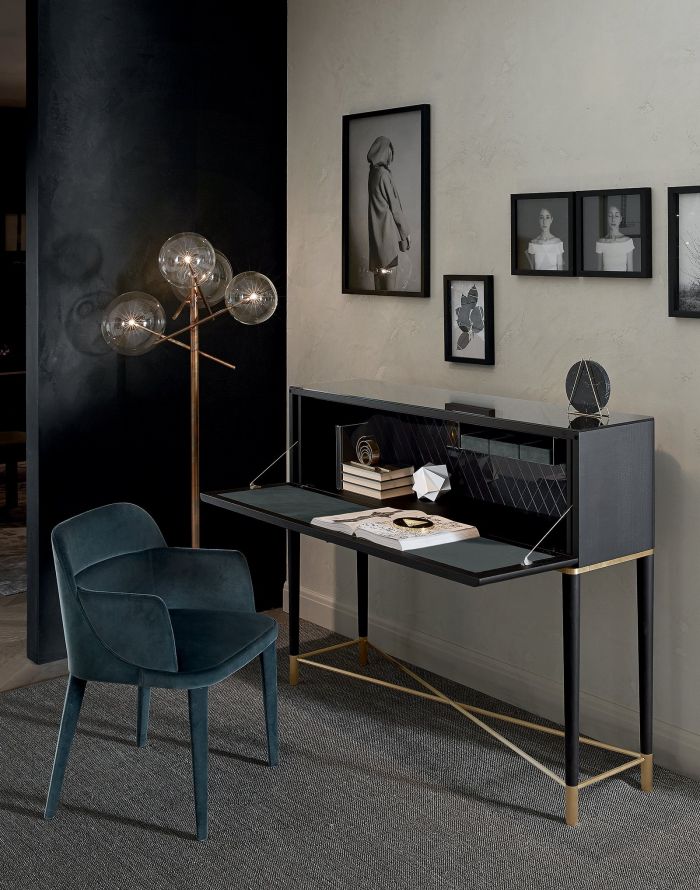 Tama Secrétaire has a flap that acts as a surface, it encloses a very elegant interior given by its upholstery, storage space and high quality finishes, its opening activates the 8 watt 108lm/w 3000k LED interior light. Once closed, Tama Secrétaire is a beautiful desk with a modern and simple design and an elegant finish. Tama Secrétaire, the decorative accessory by Gallotti & Radice.