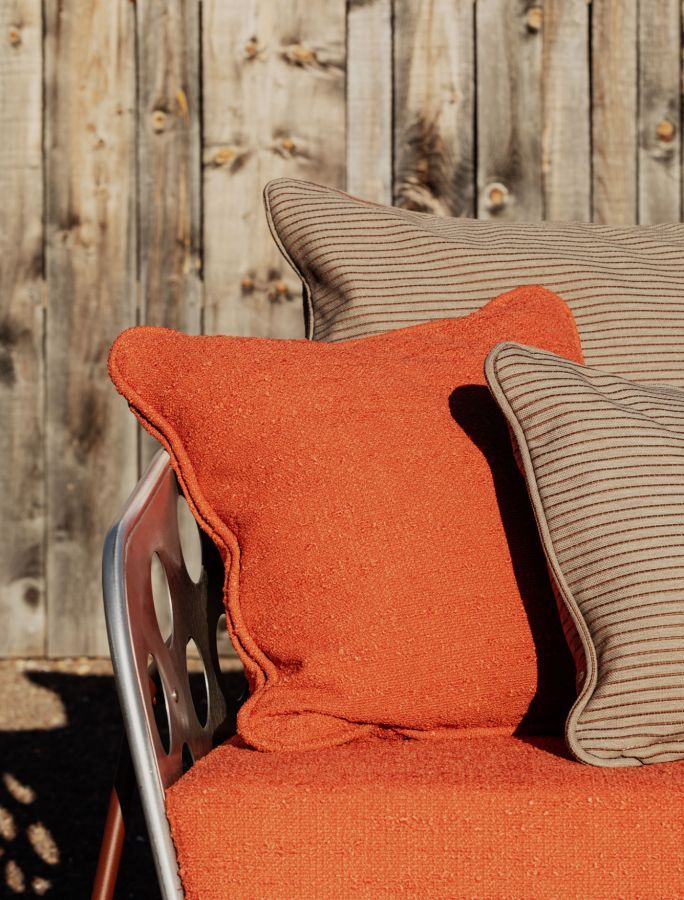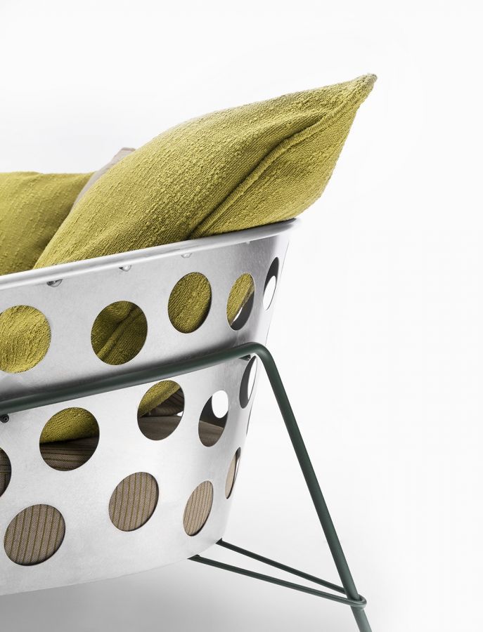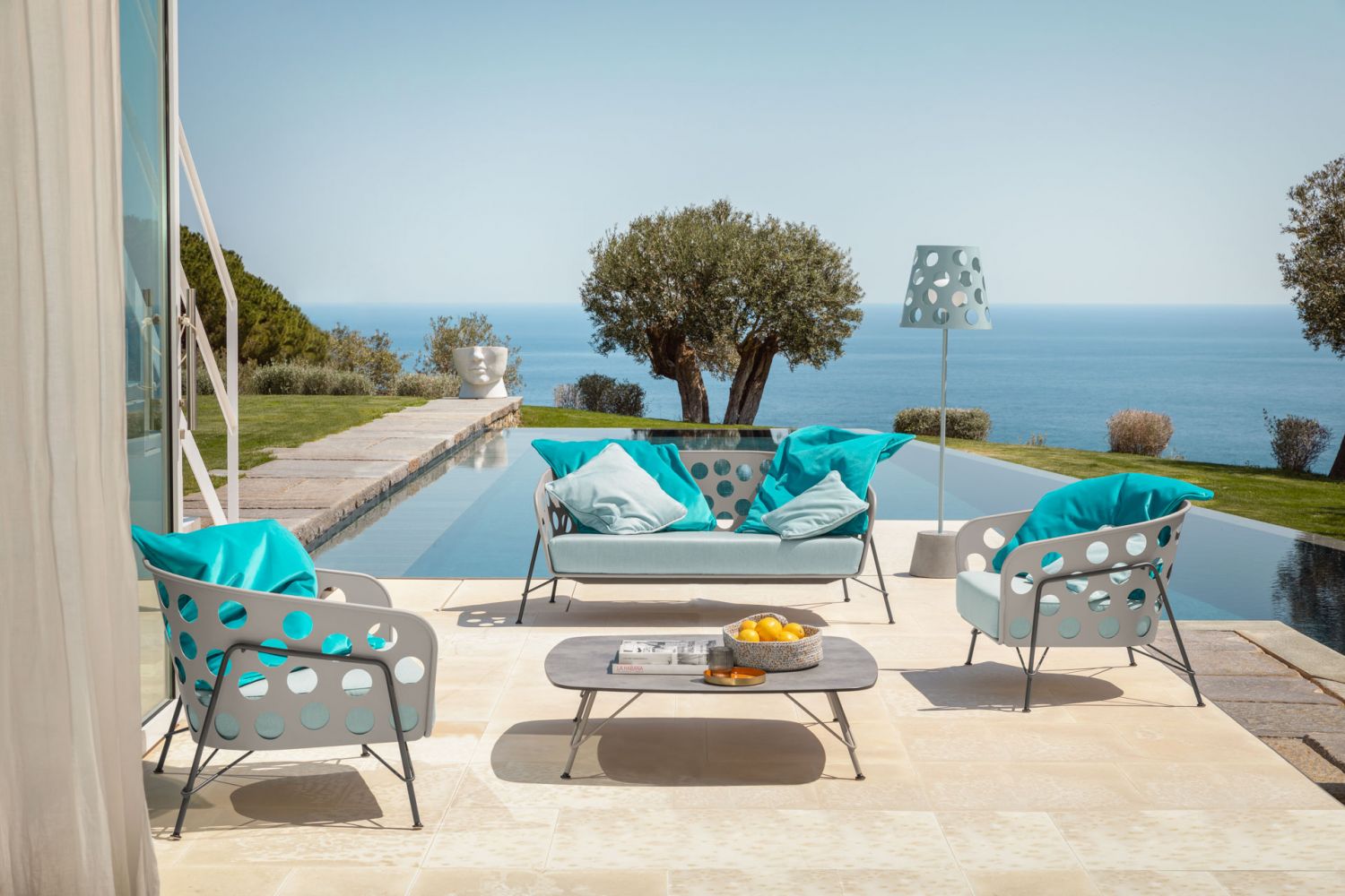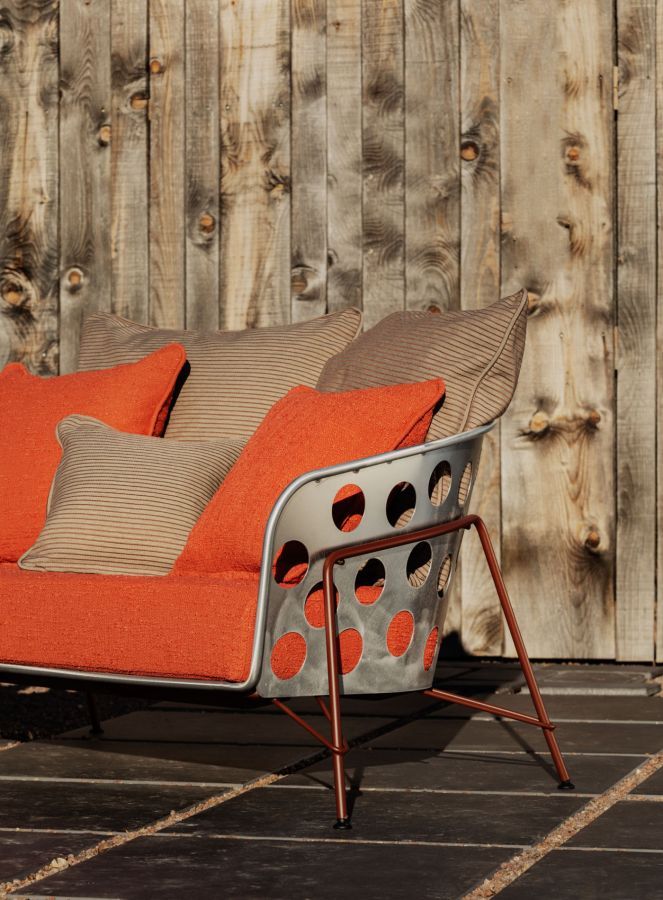 The Bolle outdoor sofa is a large hollowed shell, dotted with openings like a surface crossed by air bubbles, designed to be lived outdoors with ease. The perforated structure interacts with light and shadows, lightened by thin legs that lift it from the ground and make it appear almost suspended. At the center, a single generous seat cushion welcomes the body, while the backrest takes shape through a constellation of soft cushions that invite spontaneous relaxation. A sofa that turns outdoor spaces into places to be enjoyed slowly, between comfort, air and lightness. Graphic yet welcoming, airy yet deep, the Bolle outdoor sofa is by Midj.