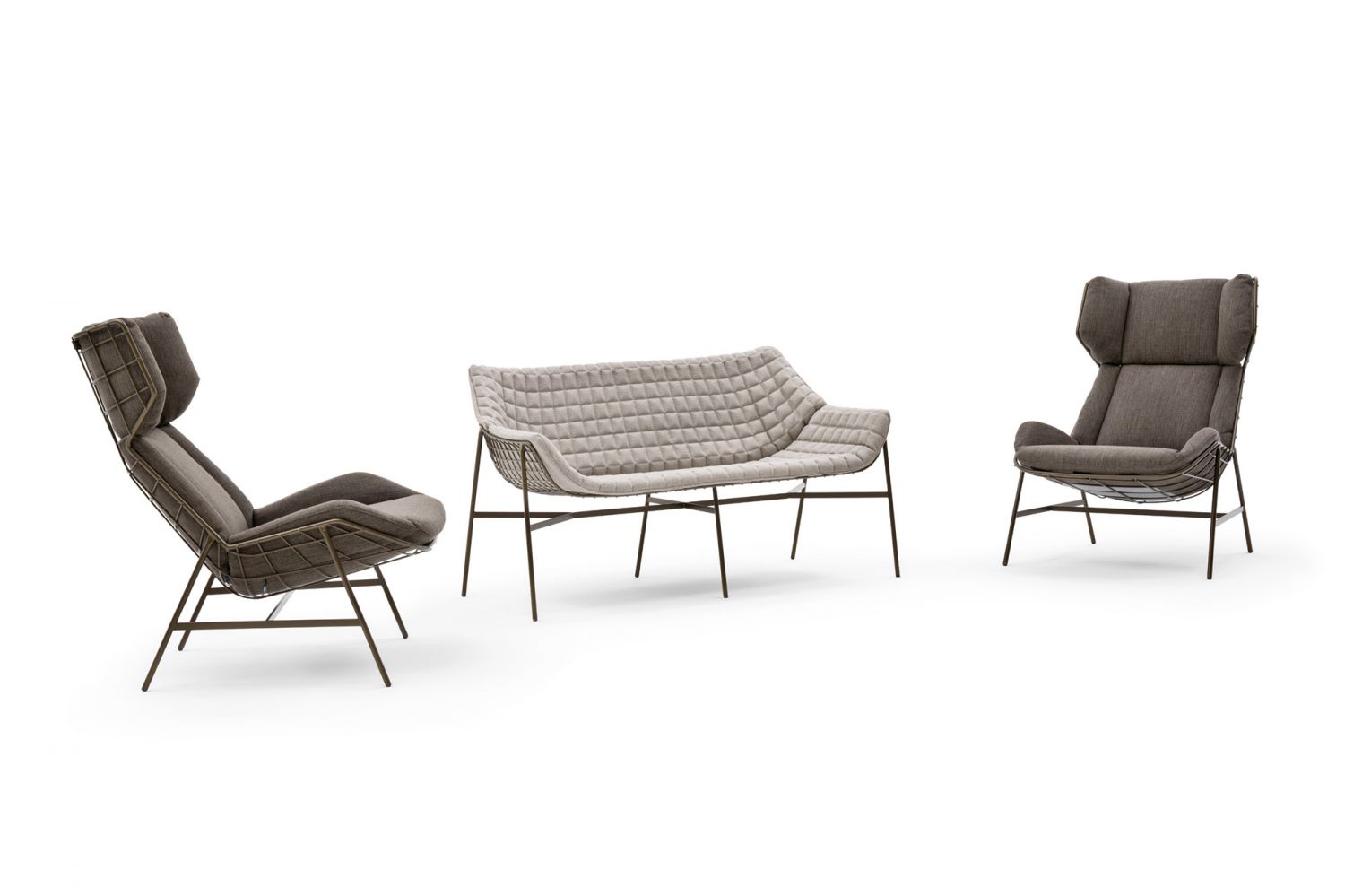 Summer Set is a series of outdoor complements with a modern design. very particular. Summer Set armchair has a powder coated aluminum structure and the seat, enveloping and grilled, has a cushion with visible stitching and finely quilted. Varaschin offers Summer Set also in rocking armchair version and in Summer Set Bergère Relax version. Summer Set Bergère Relax is the armchair with high back: the structure has a comfortable and spacious line, the cushion softly covers the seat, the footrest beautifully completes the comfort for a total and satisfying relaxation. Sunmmer Set armchair has a particular charm, a lot of personality and a lot of comfort. Summer Set is the outdoor armchair you like, it is the armchair by Varaschin.