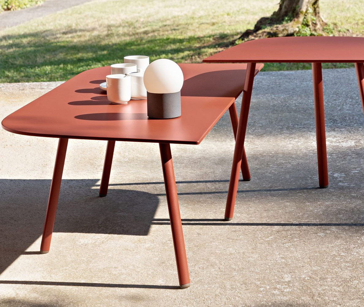 Mosaiko is an outdoor table in painted aluminum with three or four legs and a solid or stippled top. Mosaiko is a whimsical and fun outdoor accessory, its modern and simple design makes it original for its multiple particular shapes on the top and its different heights proposed. Let's have fun customizing the space, both in private and public areas. Let's enjoy the quality and prestige of a great design. Mosaiko, the outdoor coffee table by Fast