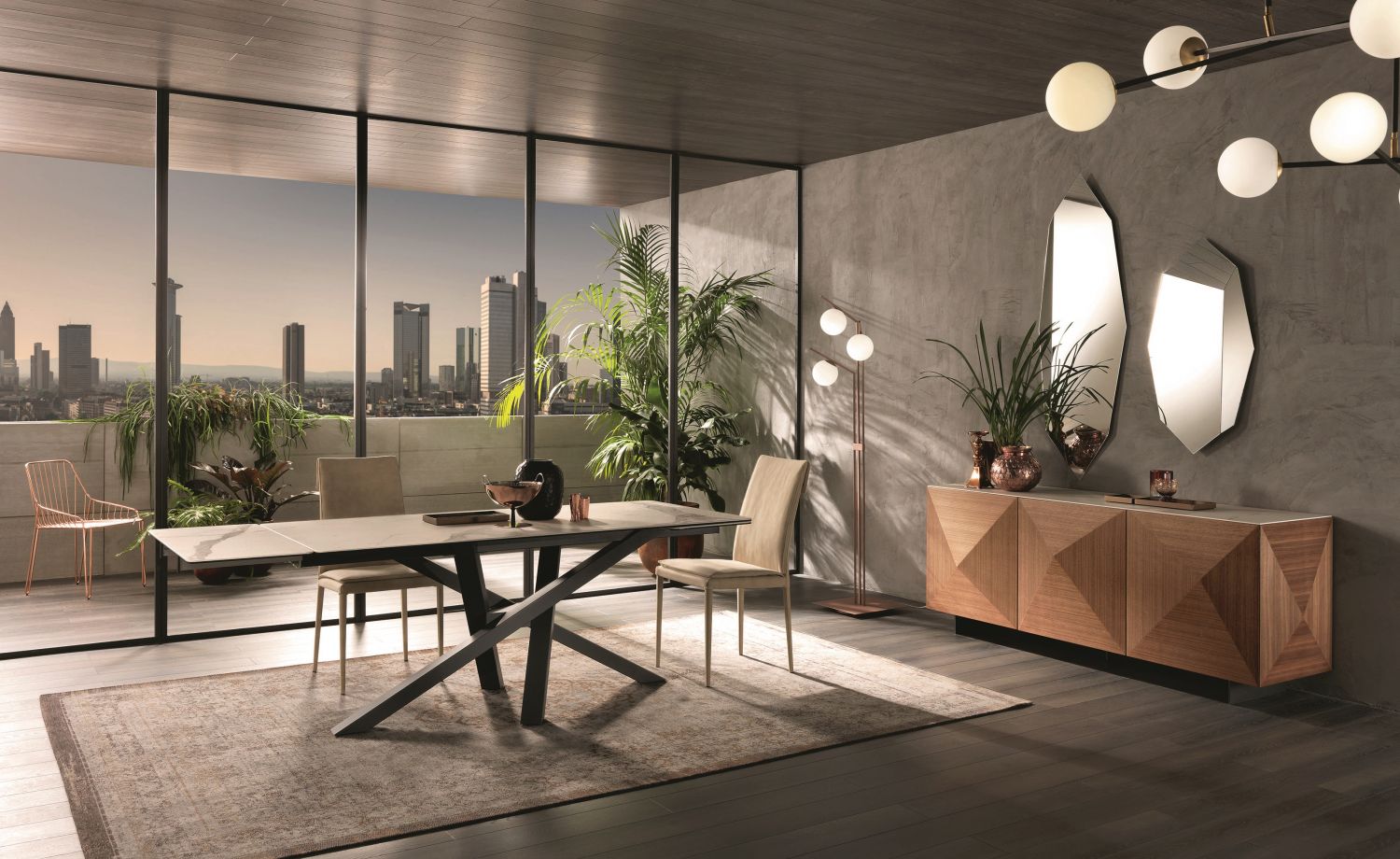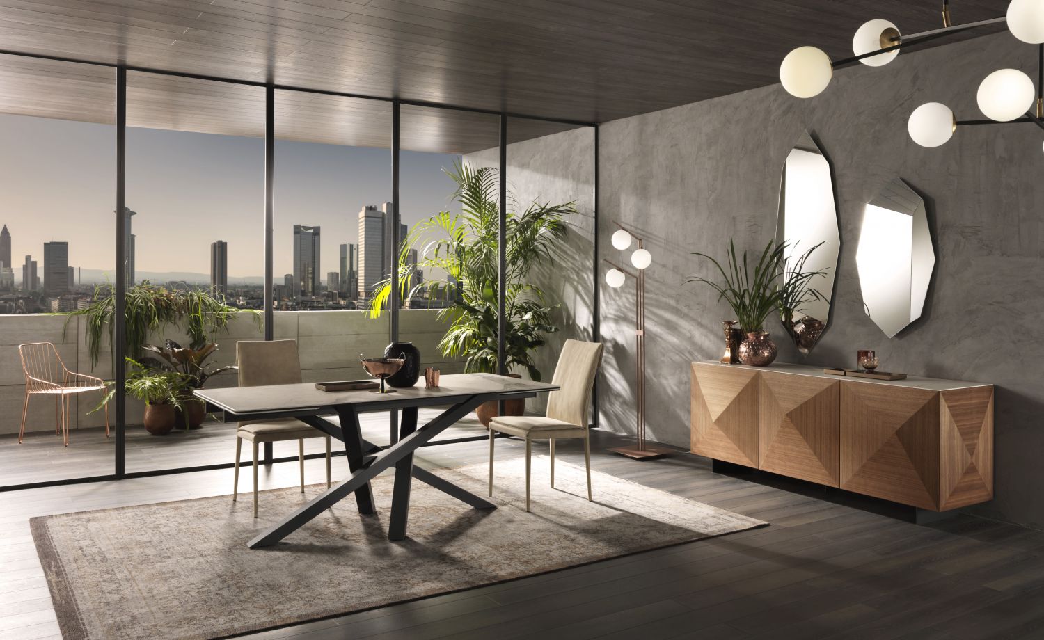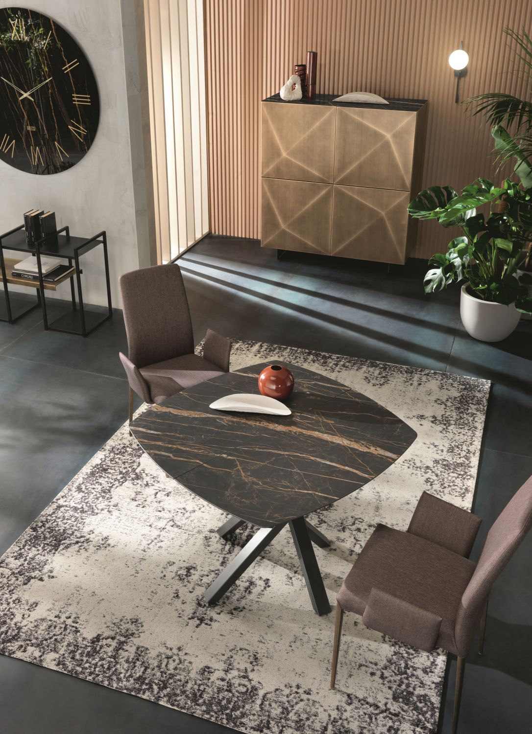 Shangai combines aesthetics and functionality: its wide, uniform surface comfortably accommodates dishes, decorative objects, and accessories, making it ideal for family dinners, social gatherings, or special occasions. Every detail is designed to convey modernity, balance, and refinement, enhancing the room with a bold and contemporary style.