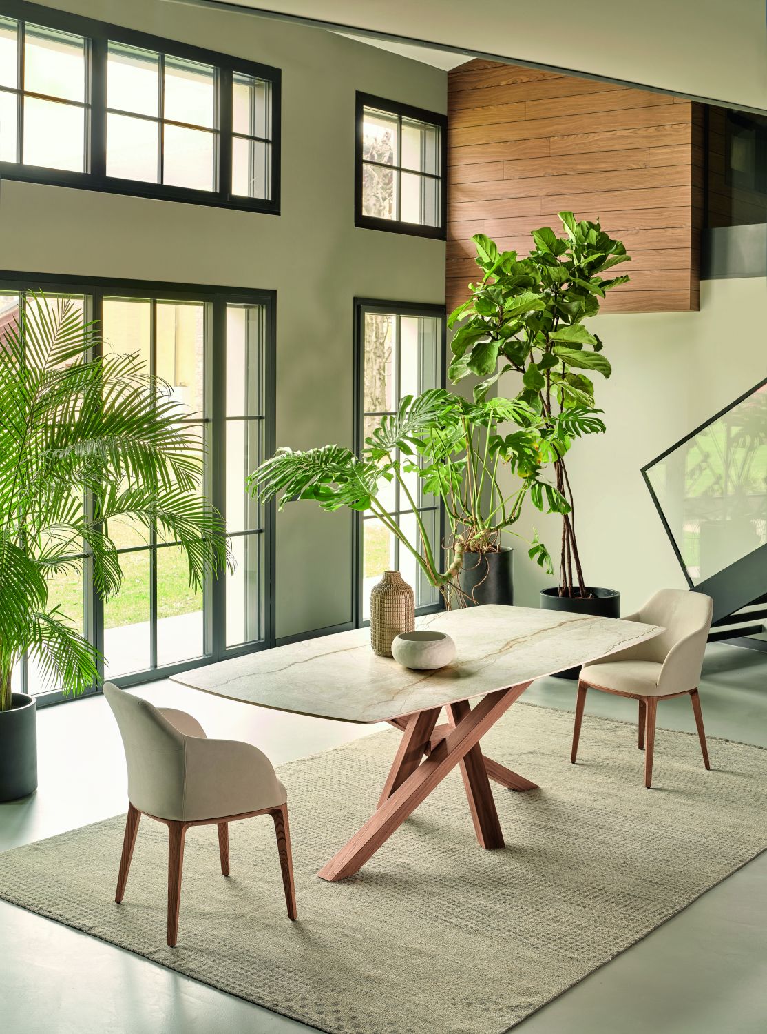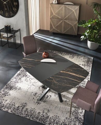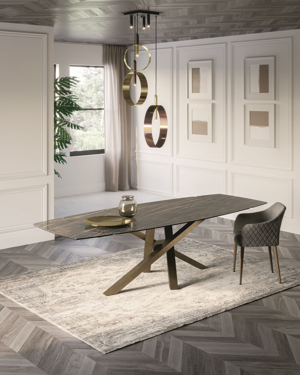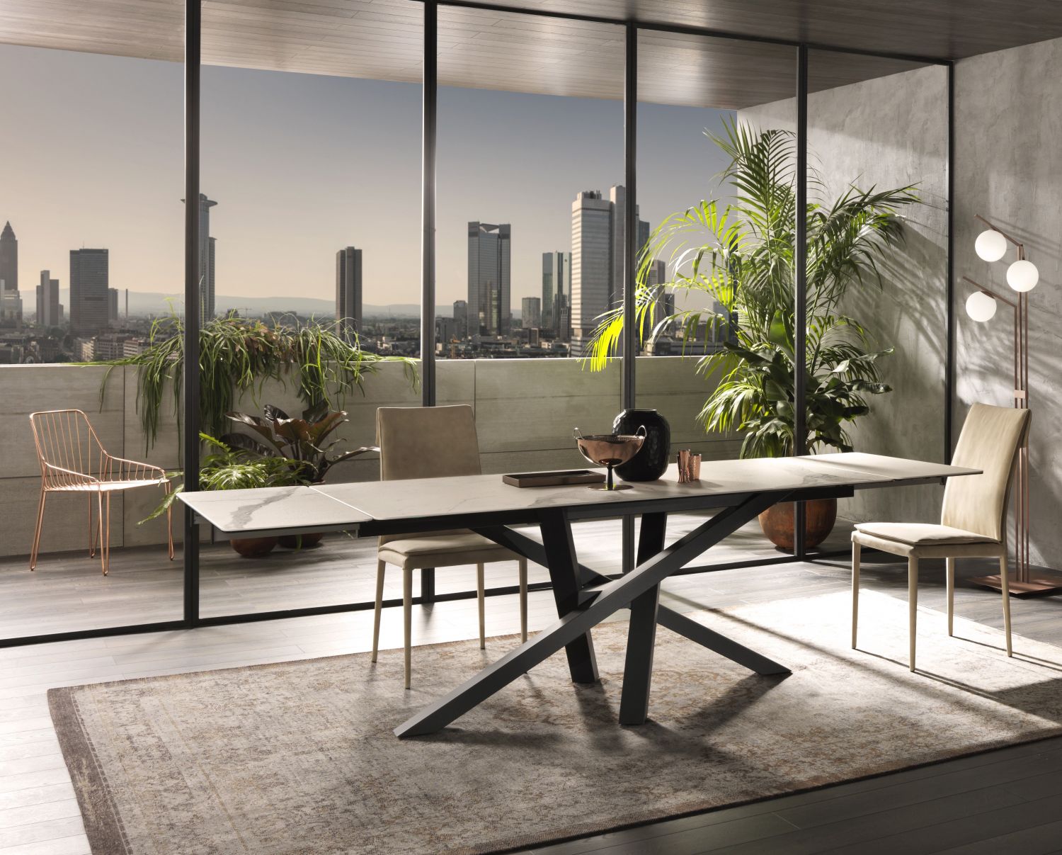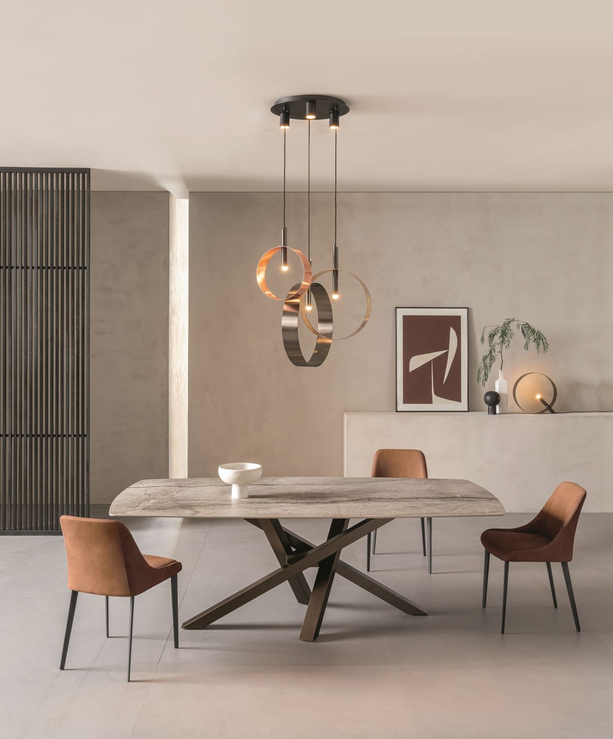 The Shangai table by Riflessi is a contemporary and distinctive piece of furniture designed to bring character and personality to the dining area. Its dynamic lines and refined structure create a strong visual impact, making Shangai a true centerpiece of the space.