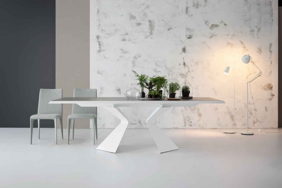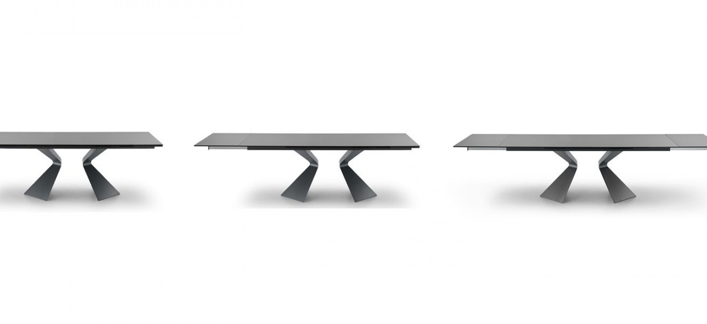 Es una mesa fija y extensible con estructura y base central de acero pintado, estantes y extensiones de cristal de 12 mm. de espesor. La mesa especialmente se caracteriza por al base, las patas que recuerdan la forma de la proa de un barco. Lal base de la mesa y la superficie inferior del estante de madera enchapada son suministrados con el mismo color.