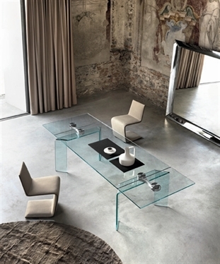 Ray es una mesa extensible con el plan de vidrio templado de 15 mm rectangular, prolungas independientes pintadas como el plan,espesor 12 mm.Las piernas desmontables de vidrio curvo de 20 mm montado a ras del suelo. El brazo que rueta es en aluminio brill con placas de acero inoxidable.