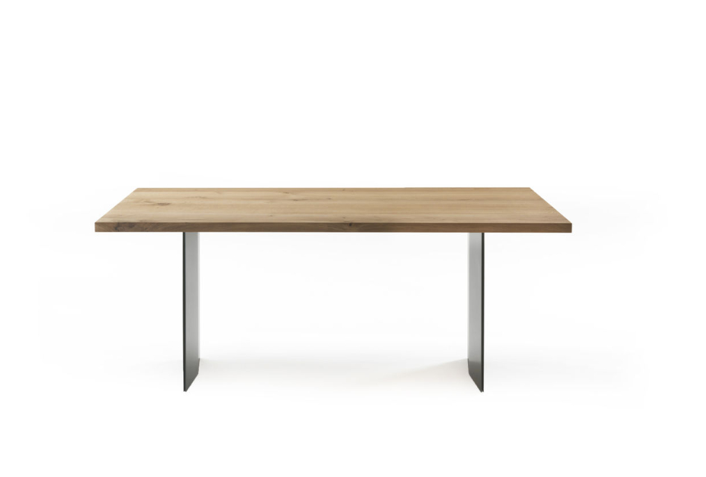 Es la mesa de madera maciza, compuesta por láminas coladas, con los lados naturales o de forma cuadrada, es espesor es de 4 cm. Es dispónible en roble y en nogal americano con nudos. La patas de fierro, laqueadas de color transparente opaco, con la característica forma de rombo.