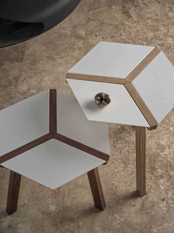 Dos alturas para la mesita Esa con estructura con tres patas y plano de forma exagonal. Es original y moderna, Esa es propuesta en un único color o multicolor.