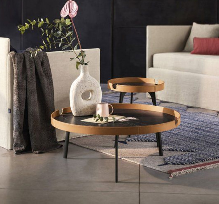 Gabri, la moderna mesa de centro redonda con tres pies en metal, superficie de Neolith y marco revestido de cuero. Neolith, una superficie compacta 100% natural y reciclable con muchos méritos, fácil de desinfectar, resistente a las altas y bajas temperaturas sin problemas de arañazos, es impermeable, higiénica, duradera y ligera. En resumen, una joya. Gabri, la elegante mesa de centro contemporánea creada para el placer de todos, Gabri, el pequeño complemento que amuebla cualquier momento y cualquier lugar.