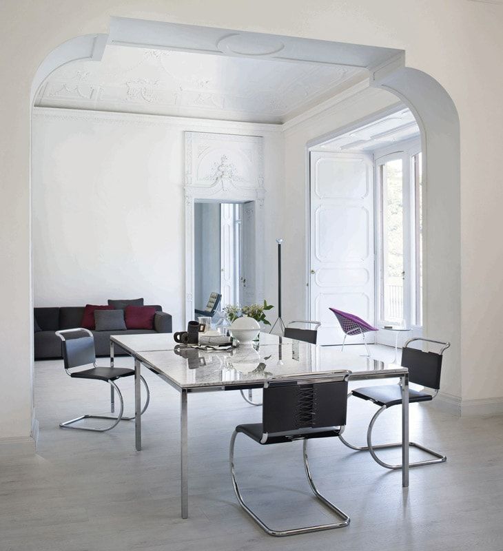 Acero y vidrio aquì es la mesita MR del diseño de Ludwig Mies van der Rohe para la colecciòn Knoll. El prestigio de los materiales y las lìneas suaves del diseño representan una ùnion de verdadera elegancia.El marco y las piernas estàn de acero inox tubular y rectangular soldadas juntas.La construcciòn sìn soldadura es revestida de un acabado cromado a espejo.