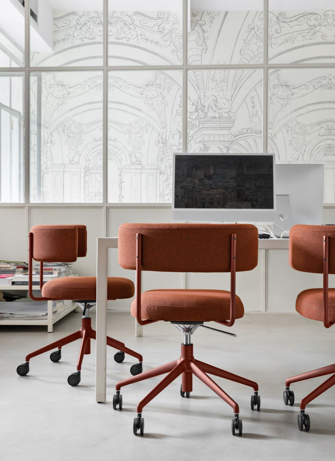 La silla de oficina Amelie lleva la elegancia retro y la ligereza contemporánea directamente al espacio de trabajo. Su estructura fina y casi invisible sostiene el asiento y respaldo llenos y acogedores, mientras que las ruedas proporcionan libertad de movimiento sin perder la gracia que caracteriza toda la colección. El asiento acompaña delicadamente a quien se sienta, creando una sensación de suspensión y ligereza. Cada detalle es personalizable, desde los tejidos hasta los colores, incluyendo los insertos a contraste, haciendo que cada puesto sea único. Ligera, elegante y funcional, Amelie oficina está firmada Midj.