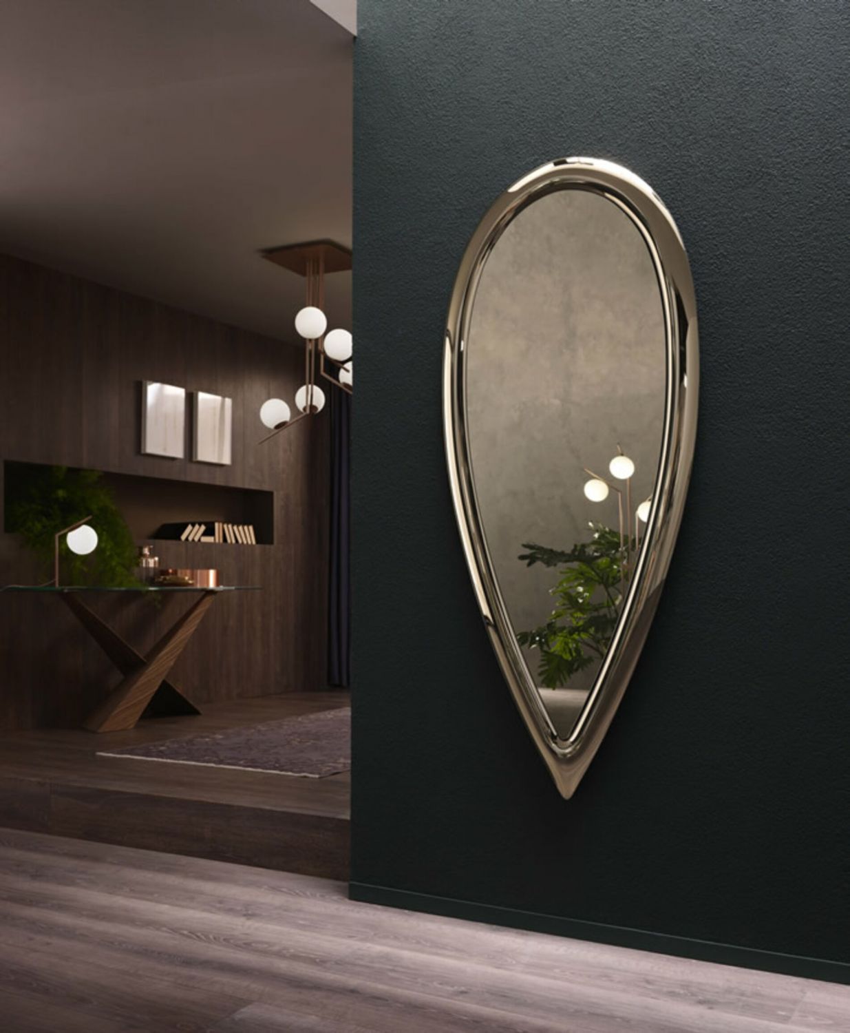 Disponible en cristal espejado o cristal broncé, Antares no es solo un espejo funcional sino también un objeto decorativo que captura y amplifica la luz de forma espectacular. Su forma escultórica atrae la mirada y añade profundidad visual a cualquier pared.
