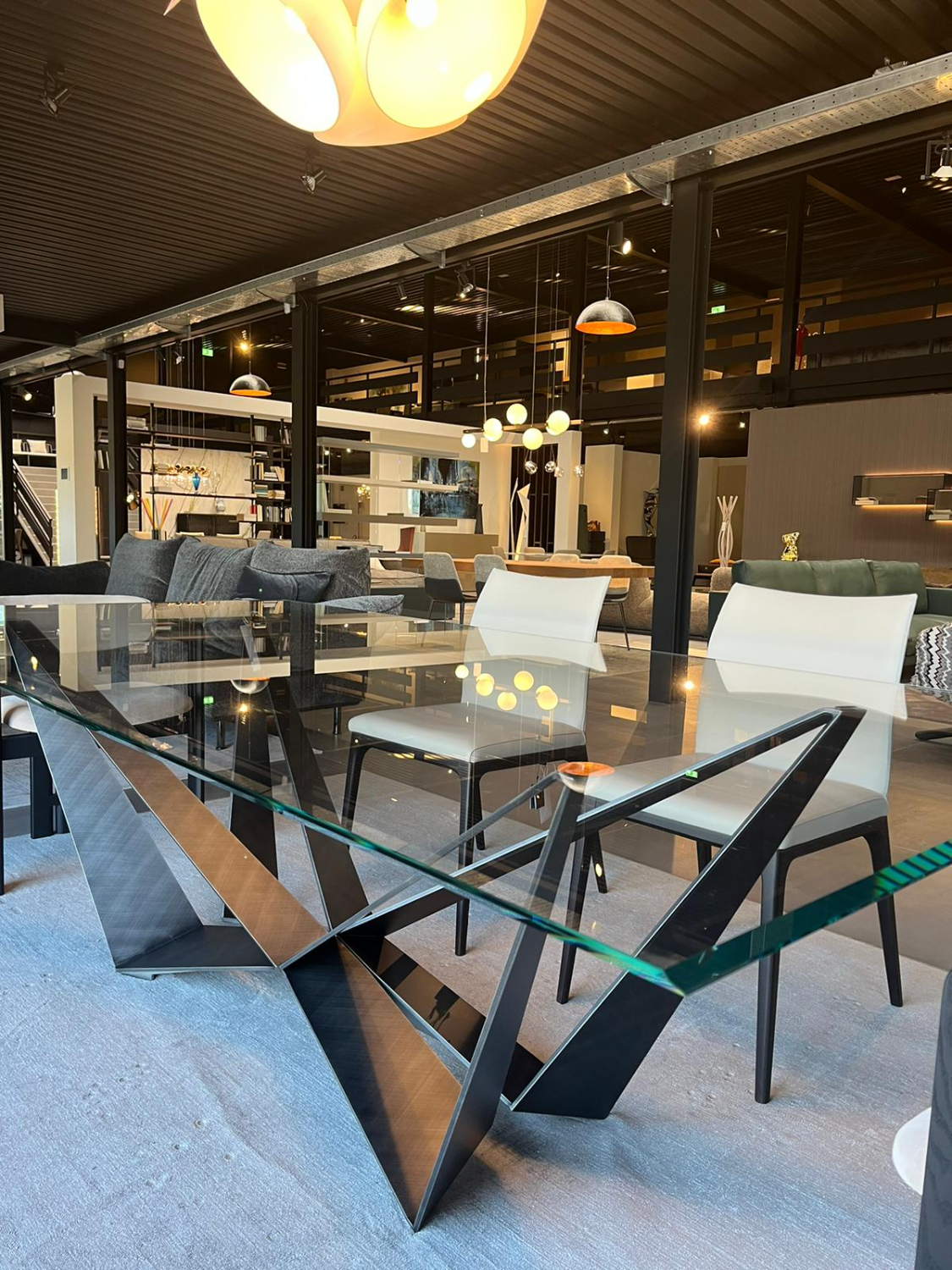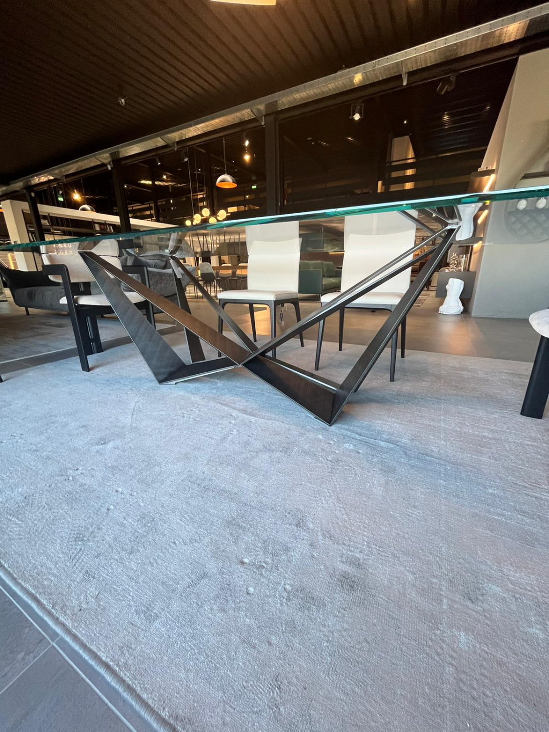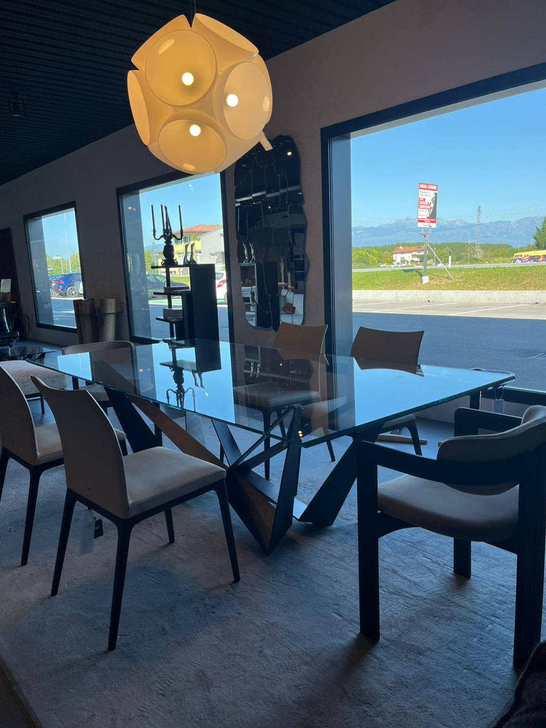 Design 2014 de Cattelan Italia, une table fixe de grand impact visuel. L'originalité et l'élégance sont renforcées par le top en verre et l'esthétique n'entrave en aucune façon la session, l'équilibre entre la créativité et le nouveau design la rend appropriée à n'importe quel environnement . La finition de la base Acier laqué transparent, identifie un revêtement transparent sur les matériel en fer brut. La présence de taches, plus ou moins évidentes, variations de couleur, rayures et bords irréguliers sont caractéristiques du traitement spécial de la matière et ne sont pas à considérer comme un défaut.
