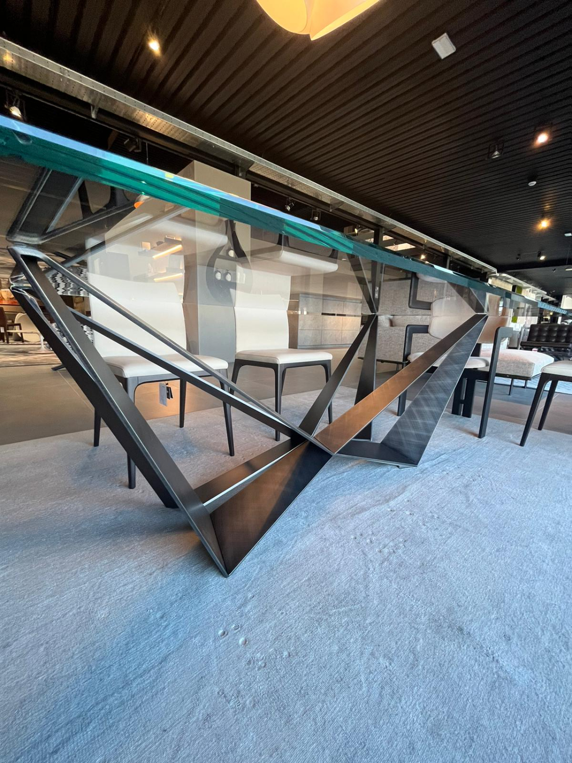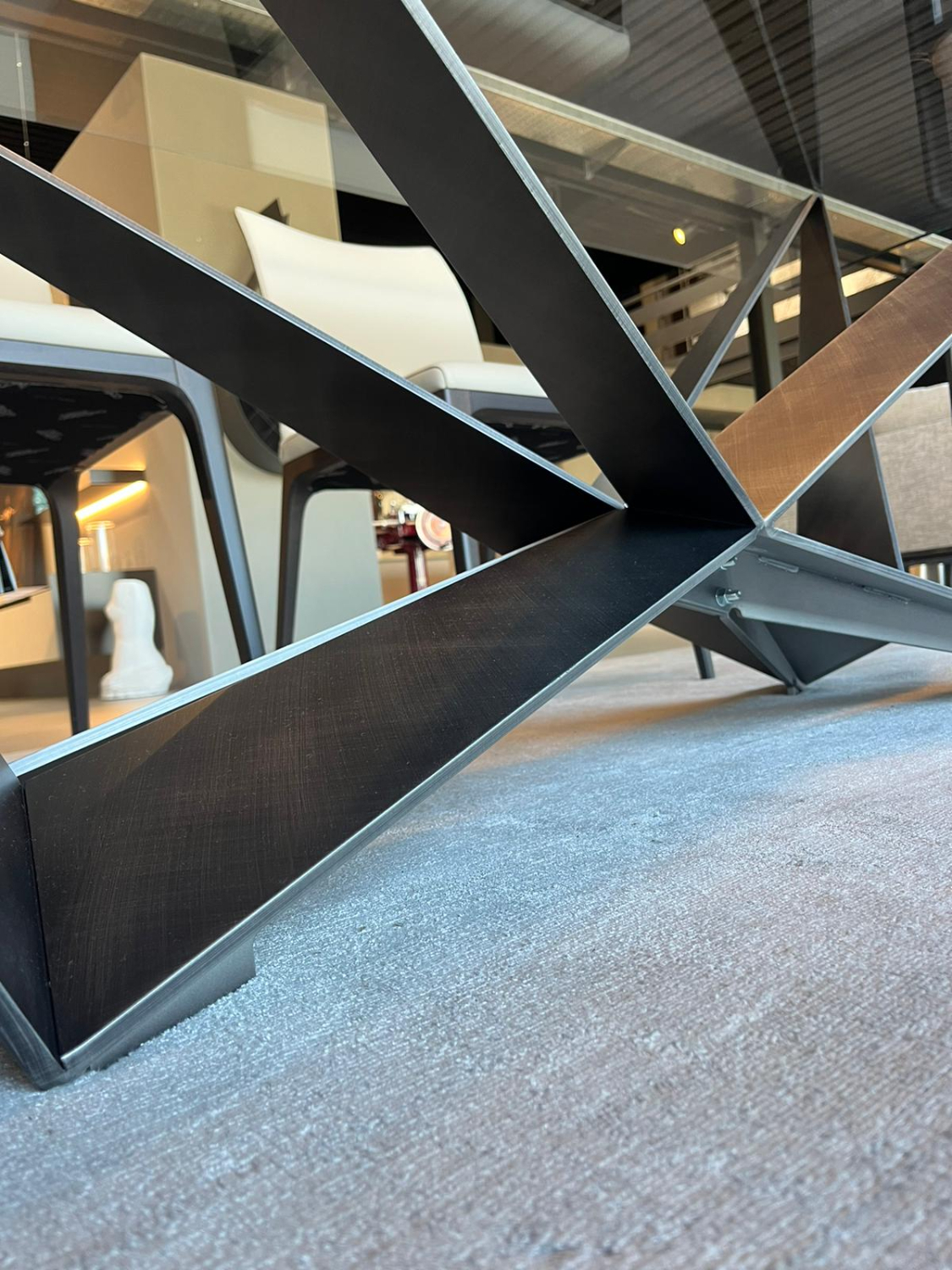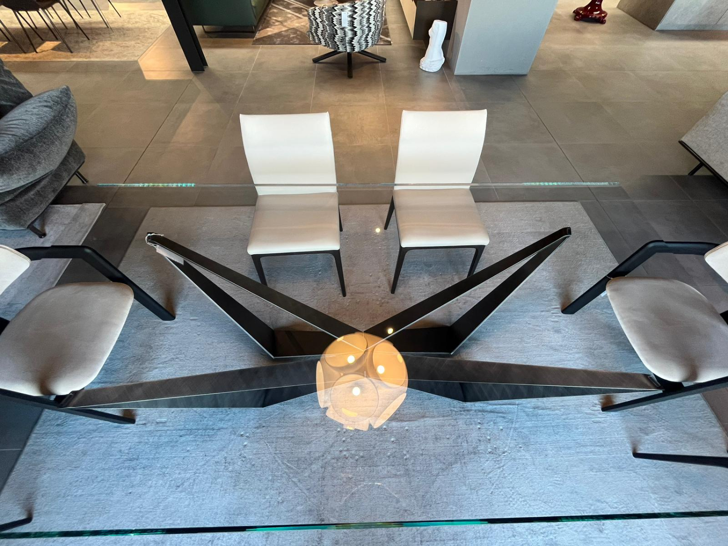 Design 2014 de Cattelan Italia, une table fixe de grand impact visuel. L'originalité et l'élégance sont renforcées par le top en verre et l'esthétique n'entrave en aucune façon la session, l'équilibre entre la créativité et le nouveau design la rend appropriée à n'importe quel environnement . La finition de la base Acier laqué transparent, identifie un revêtement transparent sur les matériel en fer brut. La présence de taches, plus ou moins évidentes, variations de couleur, rayures et bords irréguliers sont caractéristiques du traitement spécial de la matière et ne sont pas à considérer comme un défaut.
