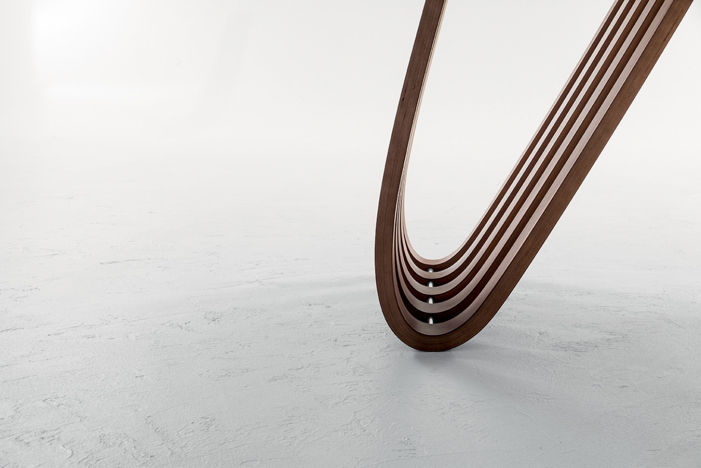 Console, table fixe ou allongeable avec rail en aluminium et plateau en verre, bois ou marbre. Le tout soutenu par une base réalisée en multicouche, courbe thermo et revêtue en noyer ou chêne foncé. Un design audacieux qui donne vie à une sculpture en vrai style italien.
