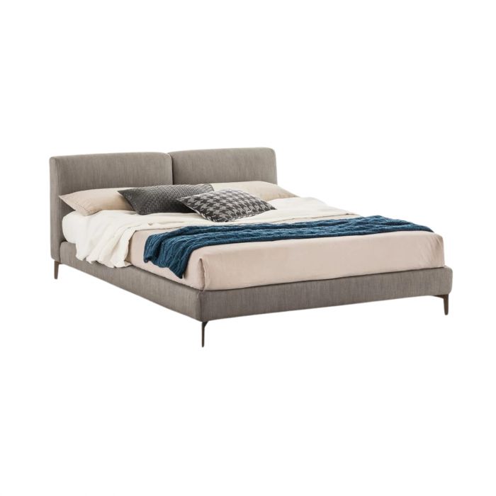 Le lit Margot est réalisé en tissu, en cuir ou en écocuir et pose sur des pieds en métal black nickel brillant. Épuré et contemporain avec un dessin