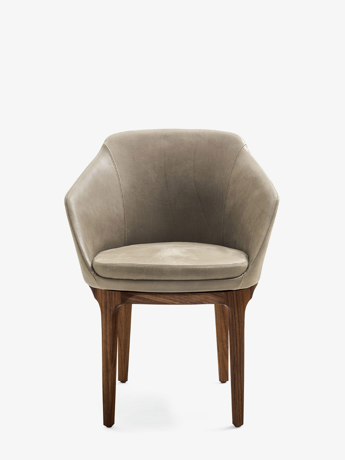 Poltroncina elegante ed avvolgente, con scocca in poliuretano espanso in linea di continuità tra schienale e braccioli, dotata di morbido cuscino d’appoggio integrato nella seduta. Disponibile in due varianti con gambe in legno o ferro.