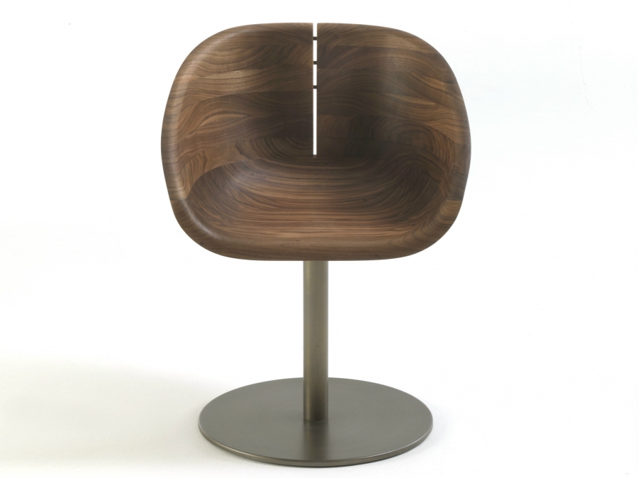 Sedia con schienale e seduta ricavata interamente da liste in legno massello e incollate fino a formare questa caratteristica forma avvolgente, rivestita in pelle o in legno. Base rotonda con gamba centrale girevole in acciaio satinato.