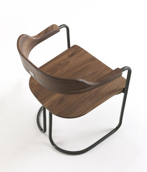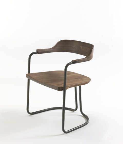 Sedia realizzata in legno massello abbinato a tubolari di ferro in linea di continuità tra struttura e i braccioli.