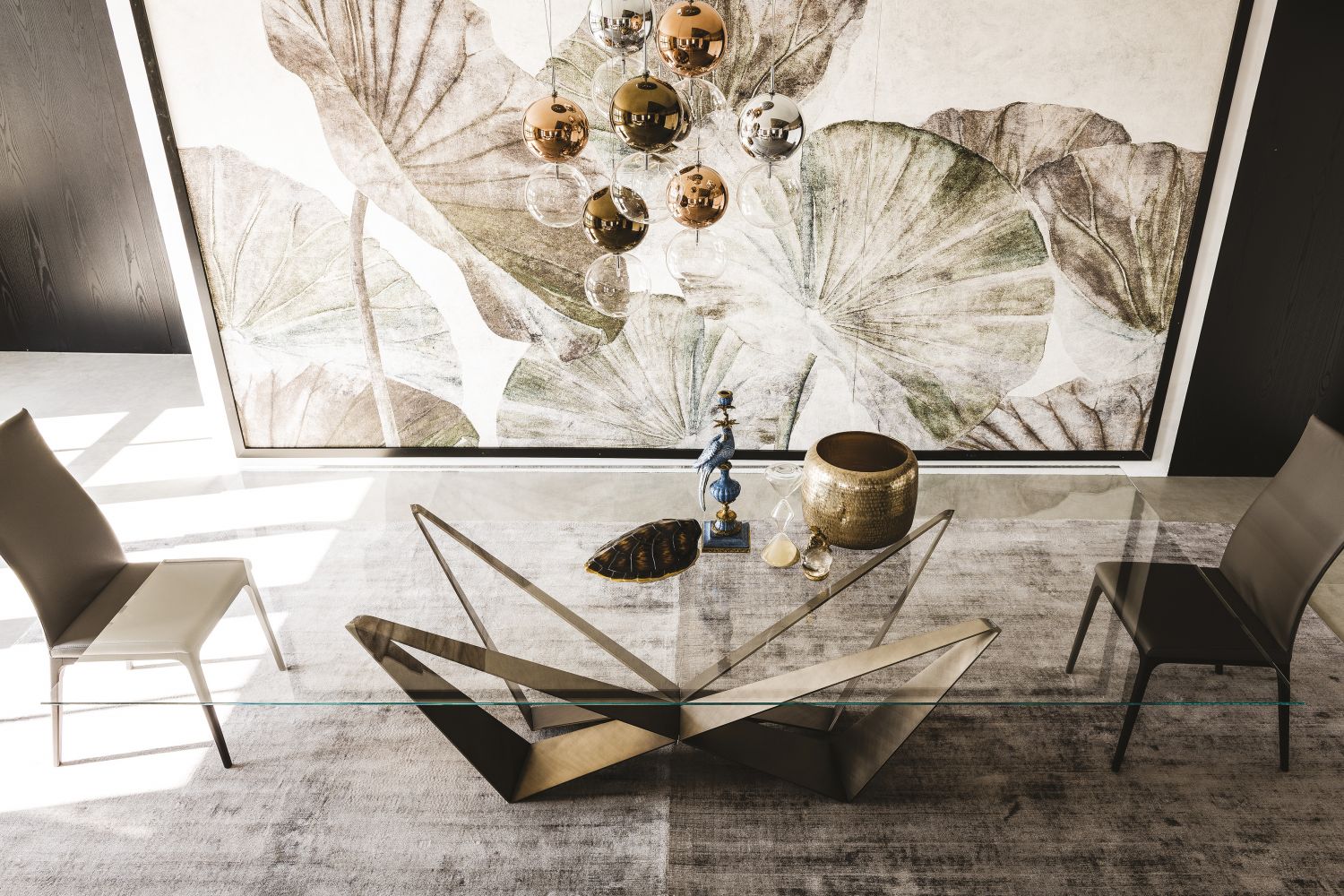 La caratteristica che distingue Skorpio è la sua struttura unica: una base metallica che sembra tessuta di linee dinamiche, evocando leggerezza e movimento, e che sostiene con maestria il piano scelto tra cristallo trasparente o extrachiaro, legno pregiato o ceramica sofisticata nelle varianti Keramik e Keramik Premium. Questo equilibrio tra robustezza e raffinatezza esprime un design italiano senza tempo, ideale per chi cerca un oggetto di arredo forte e al contempo armonioso.