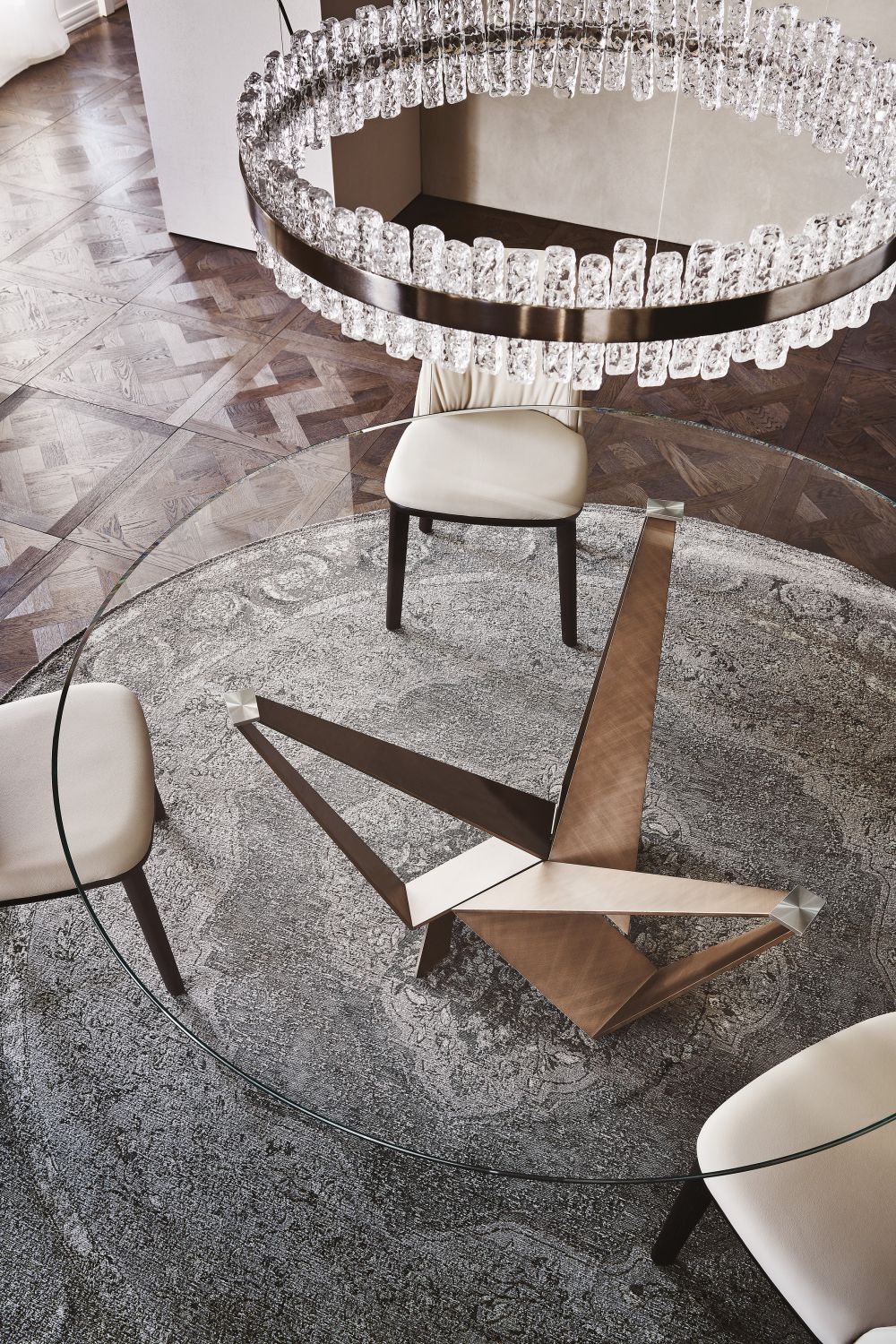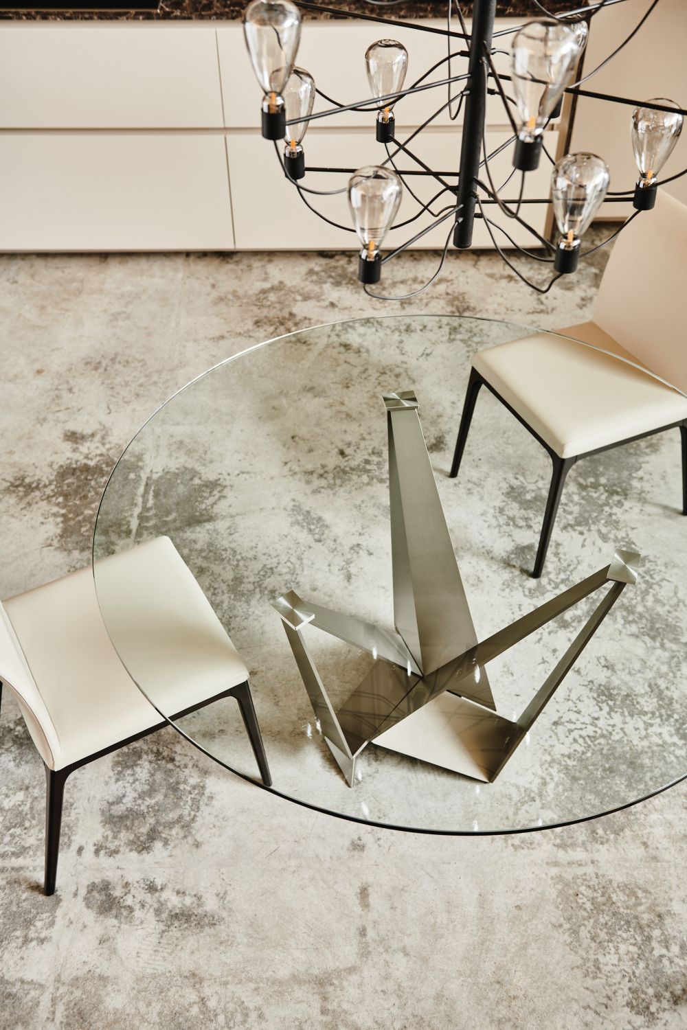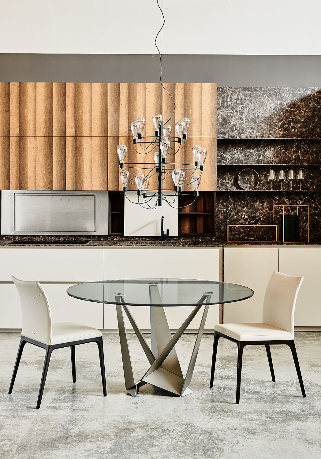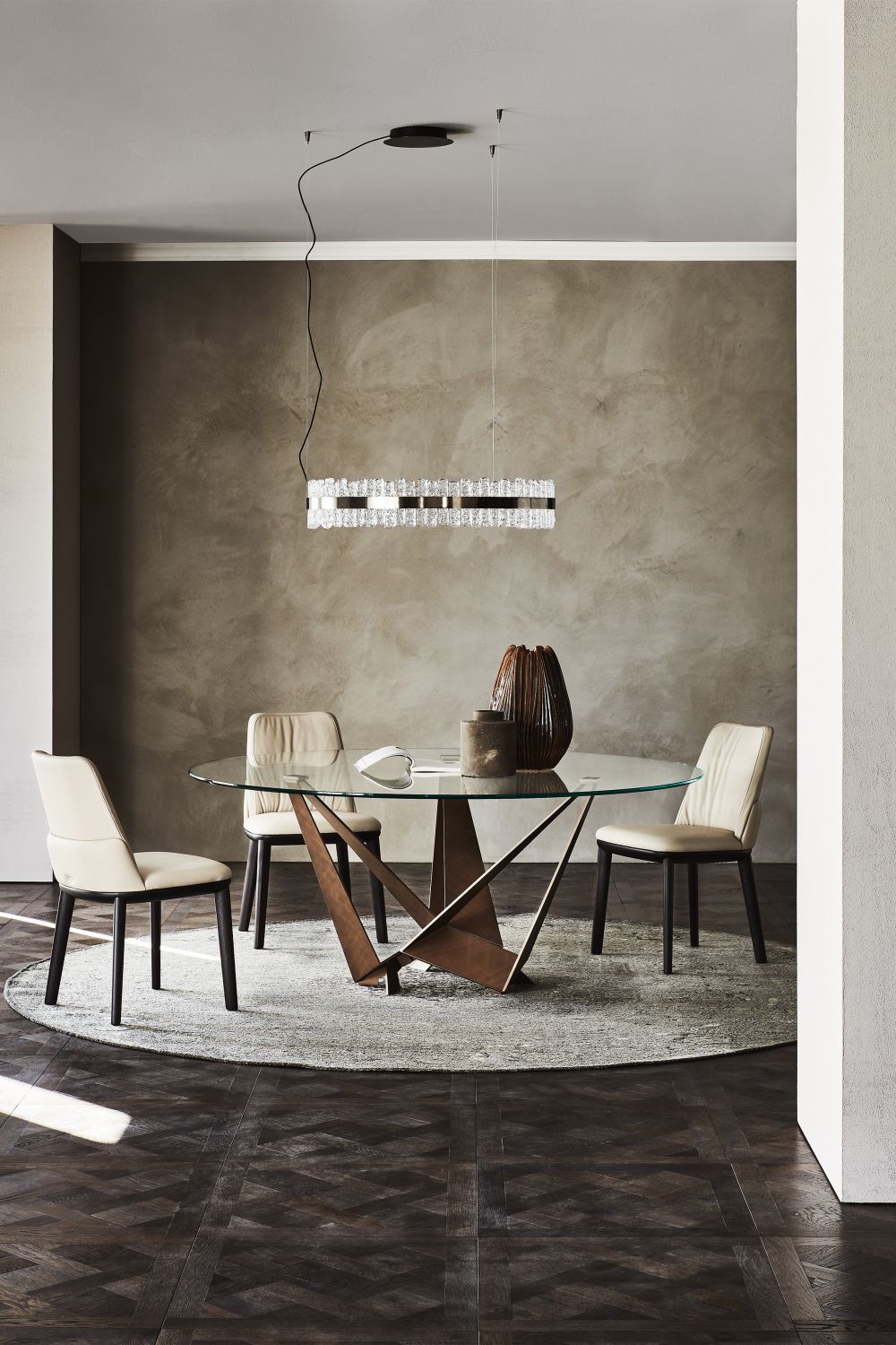 Skorpio non è solo bello da vedere. Le sue varianti con piano in vetro esaltano la luminosità degli spazi, mentre le versioni in legno e ceramica offrono sensazioni tattili calde e accoglienti. La base centrale lascia ampio spazio per le sedute, facilitando il comfort durante i pasti o le riunioni informali con amici e famiglia.