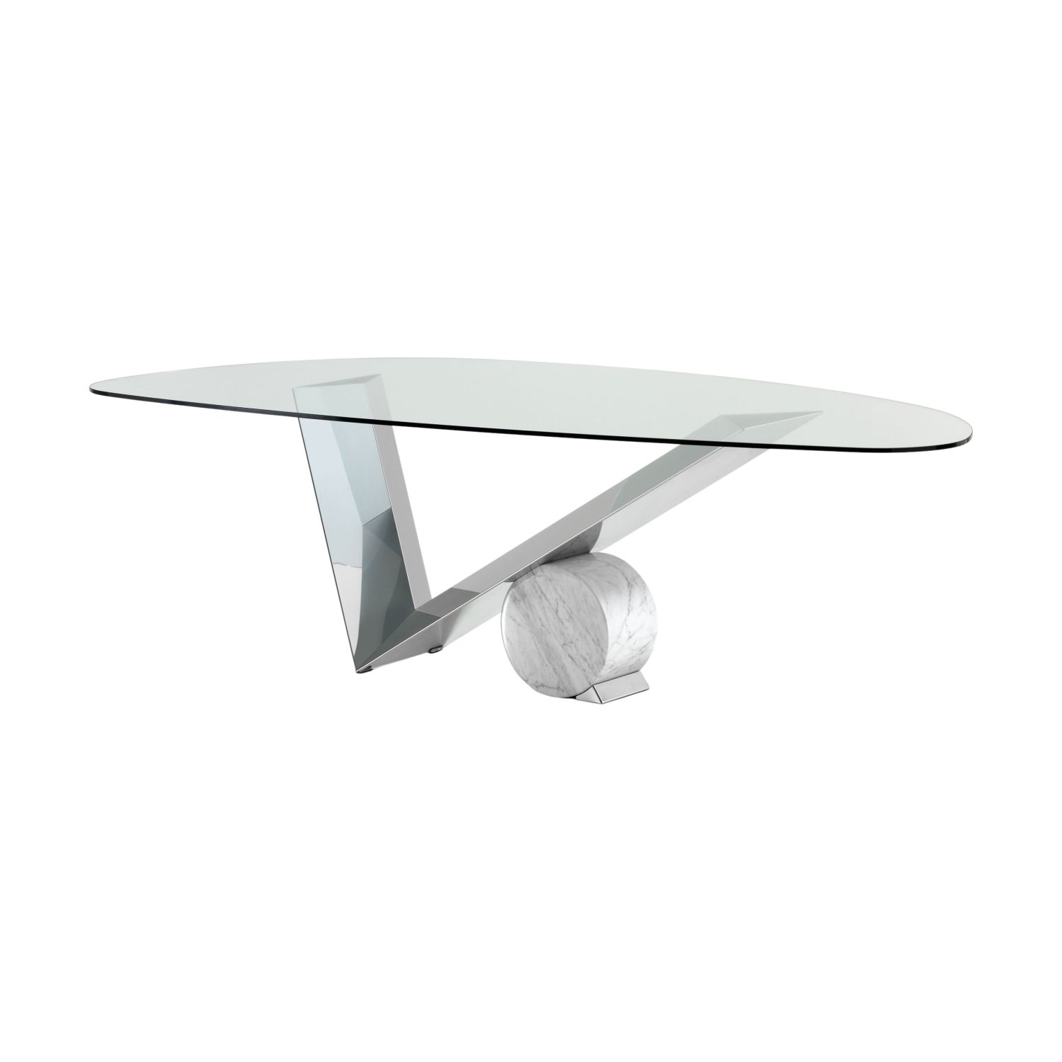 Il tavolo Valentinox di Cattelan Italia è un capolavoro di design contemporaneo che unisce presenza scultorea e leggerezza visiva, trasformando ogni sala da pranzo o living in un ambiente elegante e raffinato. Disegnato da Emanuele Zenere, questo tavolo si distingue per la sua base in acciaio inox lucido a forma di V abbinata a un cilindro in marmo pregiato (Travertino, nero Marquina o Bianco Carrara), creando un dialogo armonioso tra materiali di grande impatto e texture sofisticate. Il piano è realizzato in cristallo trasparente, sospeso con delicatezza sulla struttura, così da esaltarne la purezza visiva e far risplendere l’intero progetto.