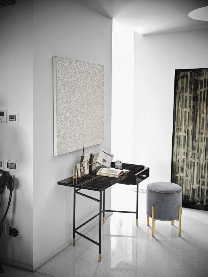 La struttura in acciaio laccato, il piano in Supermarmo, il cassetto in legno: è Vanity lo scrittoio con specchio e luce orientabili. Esile, design moderno, lo scrittoio Vanity è un complemento d’arredo sfizioso, arreda un po’ ovunque. I suoi dettagli decorativi, piedini, maniglia cassetto, supporti cornice specchio e luce, sono disponibili con laccatura diversa. Vanity, lo scrittoio firmato Bontempi.