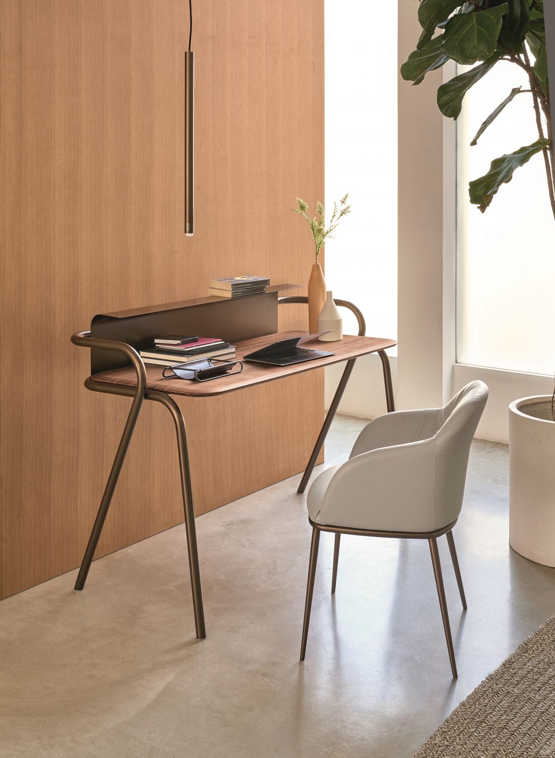 Vela Scrittoio unisce design e comfort: la superficie ampia e ben proporzionata offre spazio per computer, documenti e accessori, mantenendo ordine e pulizia visiva. La struttura solida e curata nei dettagli garantisce stabilità e durata nel tempo, mentre il design essenziale permette un facile abbinamento con sedute e complementi contemporanei.