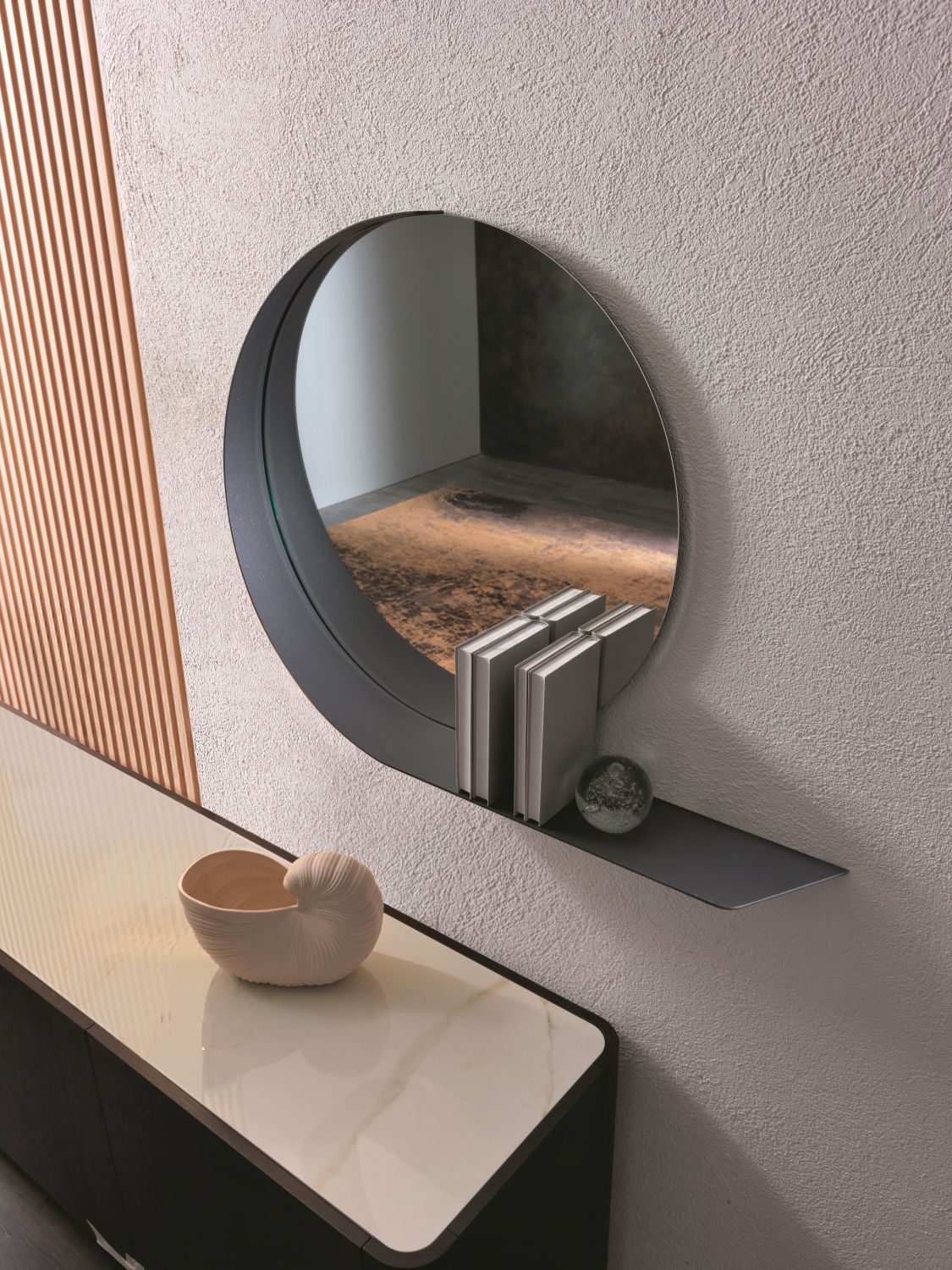 Madame è disponibile con cornice in metallo verniciato in diverse finiture come grafite, bronzo o champagne perlato, permettendo di personalizzare lo specchio secondo lo stile dell’ambiente. La combinazione tra specchio e mensola crea un abbraccio sinuoso e raffinato, portando equilibrio visivo e un tocco di design italiano negli spazi.