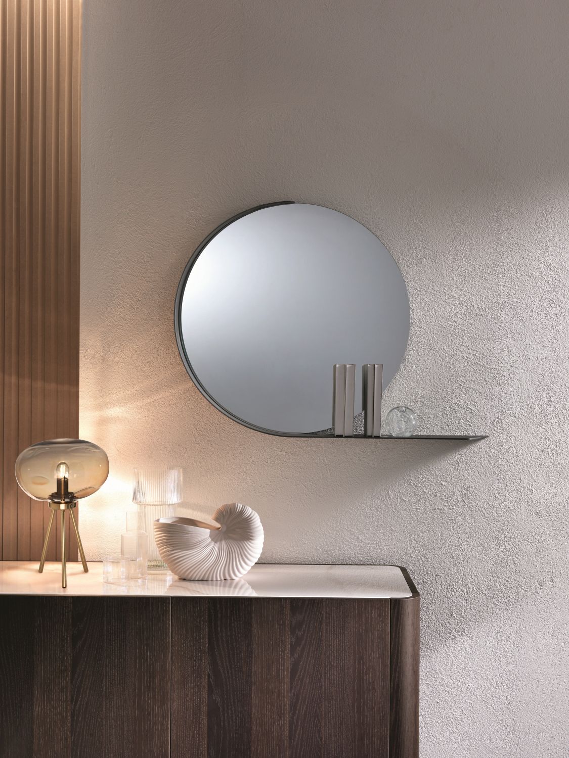 La mensola laterale non è solo un dettaglio estetico, ma offre anche una superficie pratica dove appoggiare oggetti quotidiani come chiavi, piccoli oggetti decorativi o profumi, rendendo Madame funzionale nella vita di tutti i giorni. La sua forma rotonda con mensola a lato regala continuità e leggerezza, ideale per ingressi, living contemporanei e zone di passaggio domestiche.